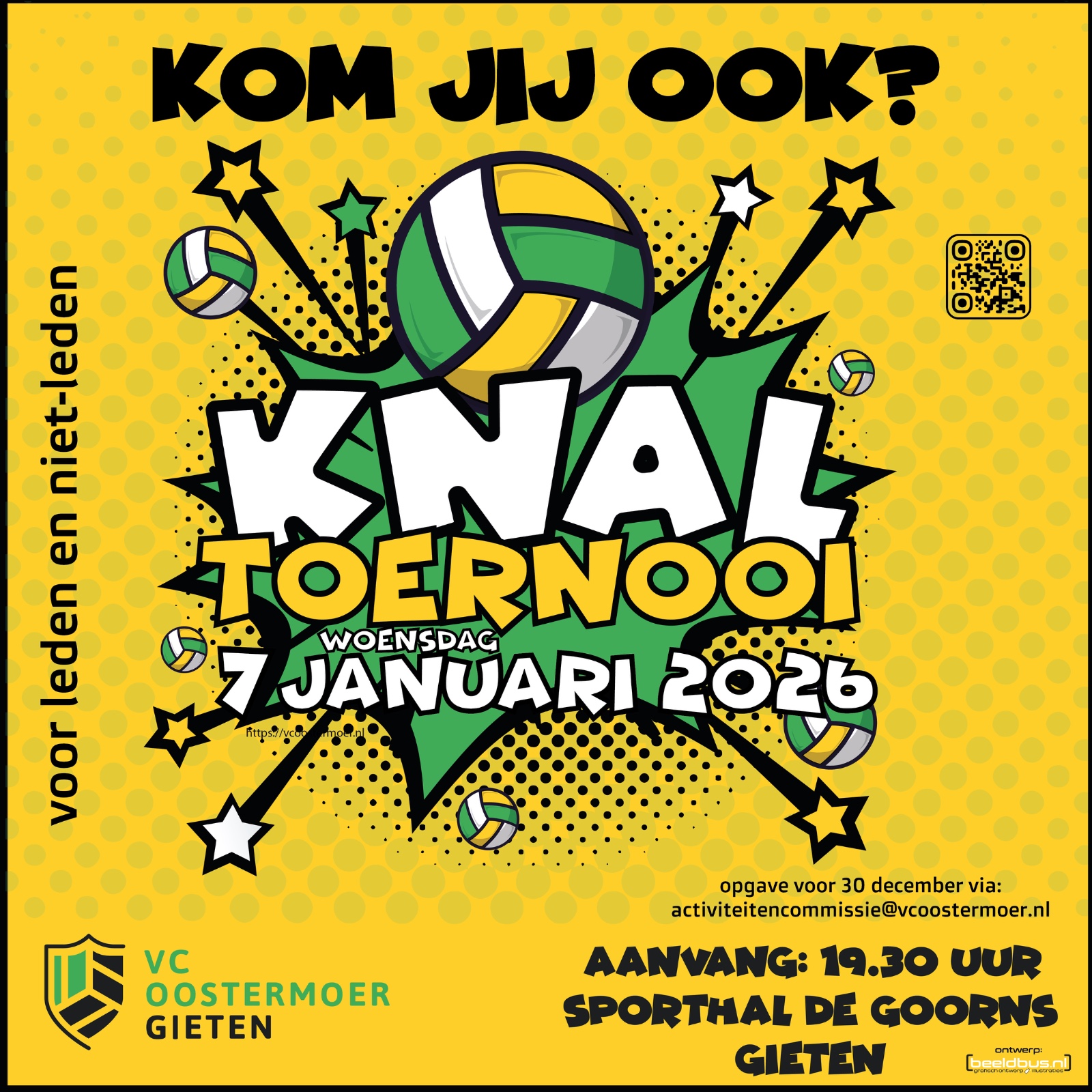 Op woensdag 7 januari organiseren we het jaarlijkse Knaltoernooi. Met dit volleybaltoernooi luiden we samen 2026 in. Zowel leden als niet-leden zijn van harte welkom, dus breng gerust een introducé mee!